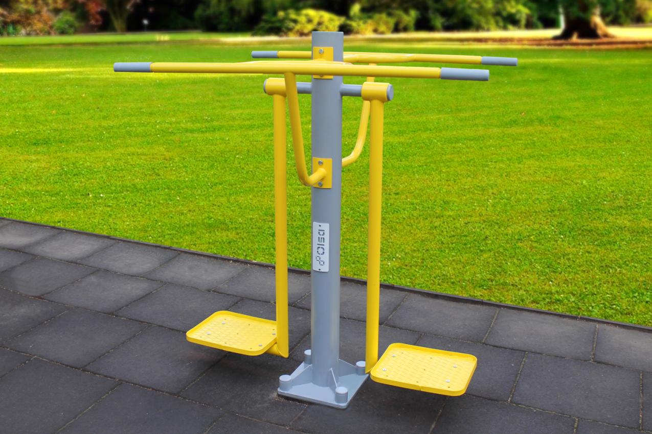 The material and design features of the exercise machine allow for intensive outdoor use for more than 12 hours per day. The supporting structure consists of a 114 mm diameter pipe with a 4 mm wall thickness, VGP pipe with a wall thickness of 3 mm, and various rectangular profile pipes with a 4 mm wall thickness.