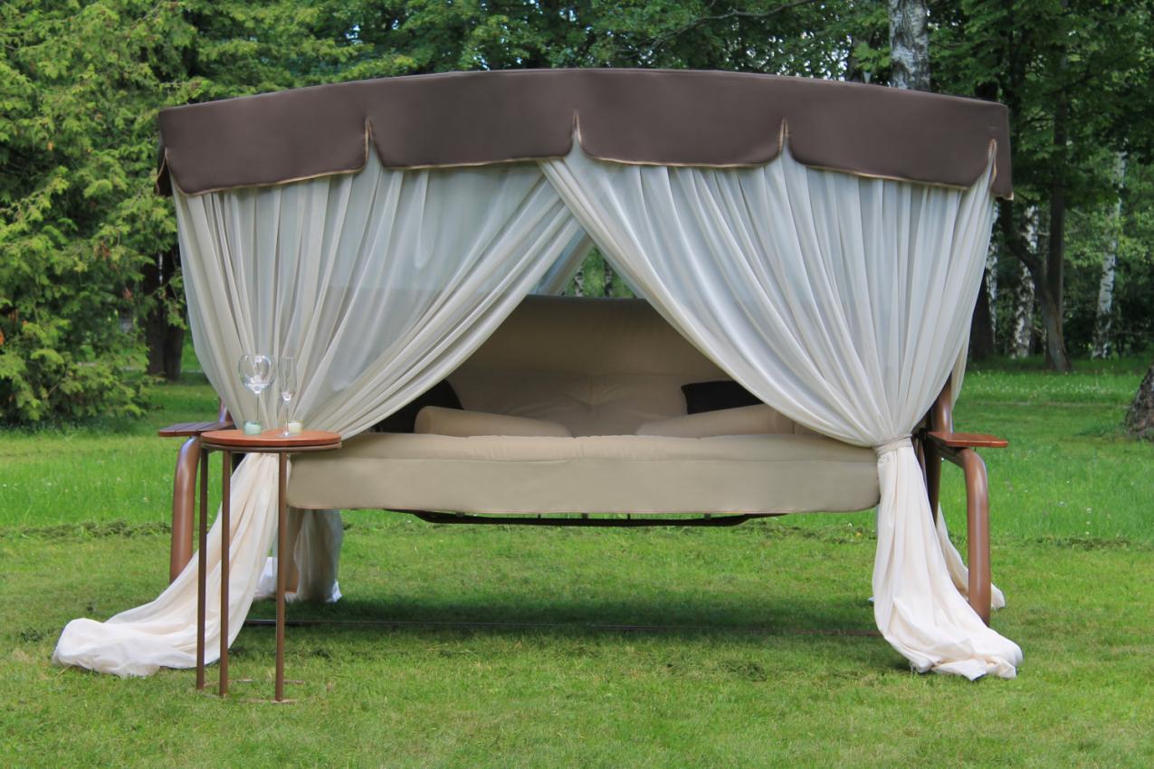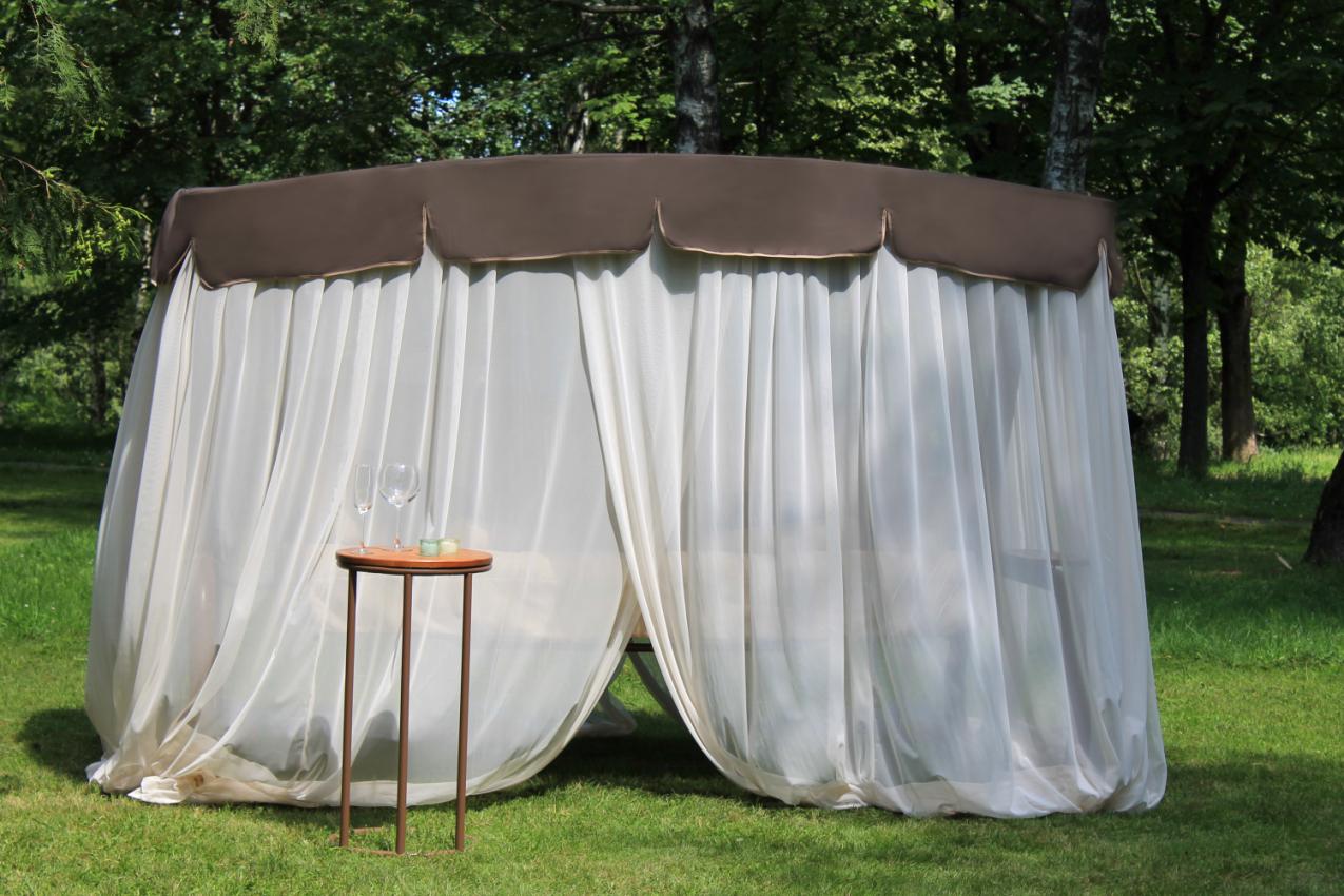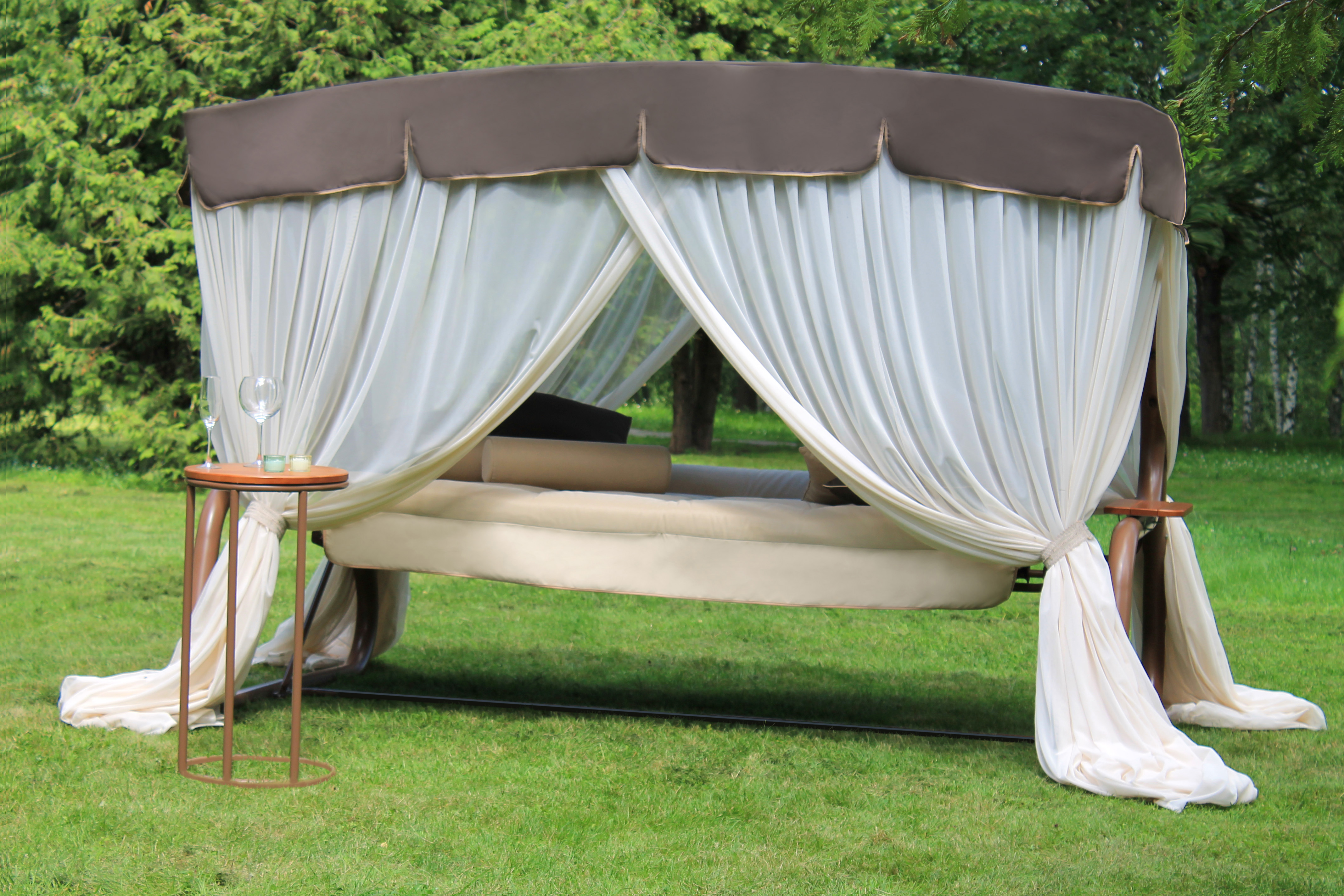 Тент: кондер шоколад, москитная сетка: пришивная трикотажная бежевая, сетка с запахом по 4 сторонам, способ фиксации по торцам с помощью ажурной тесьмы шириной 5-6 см., длина москитной сетки с дополнительным напуском по полу.