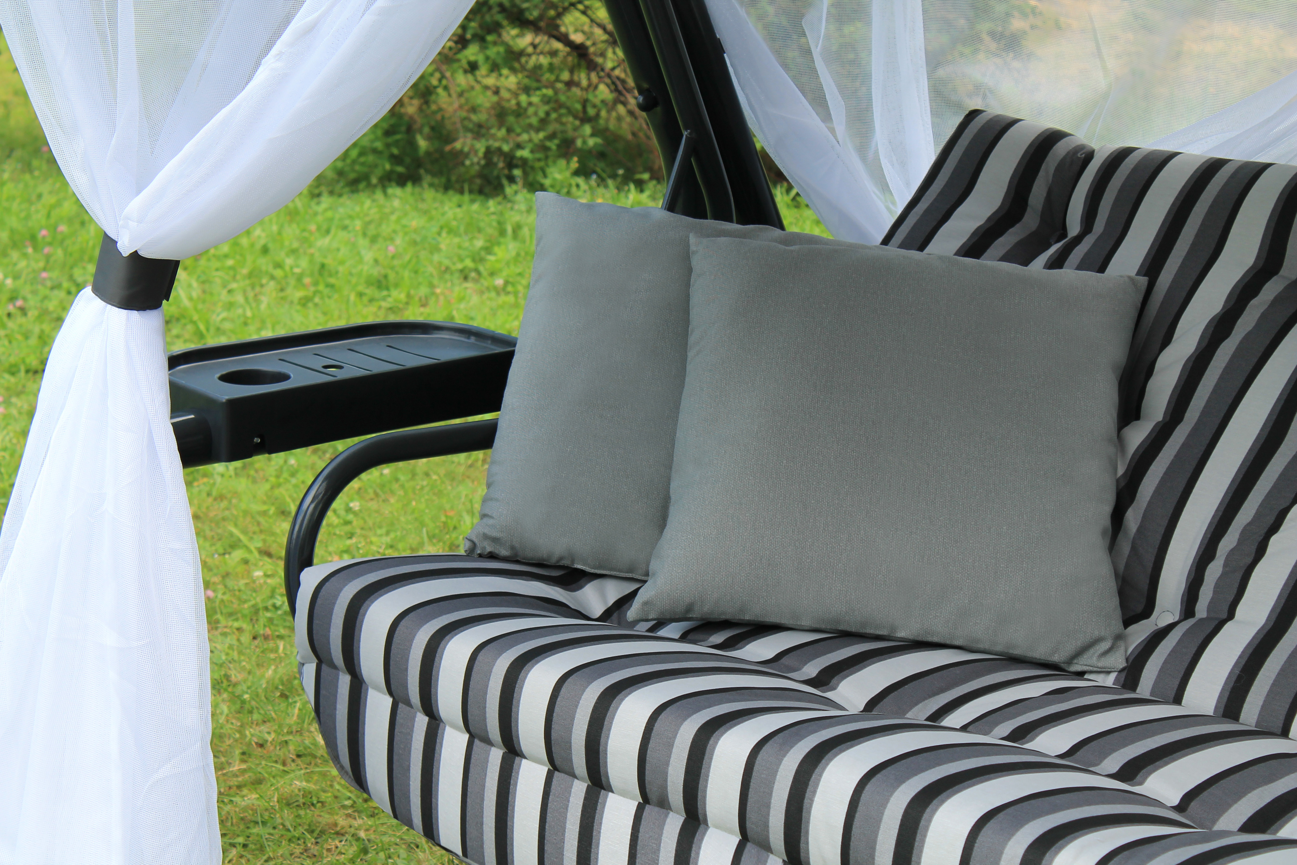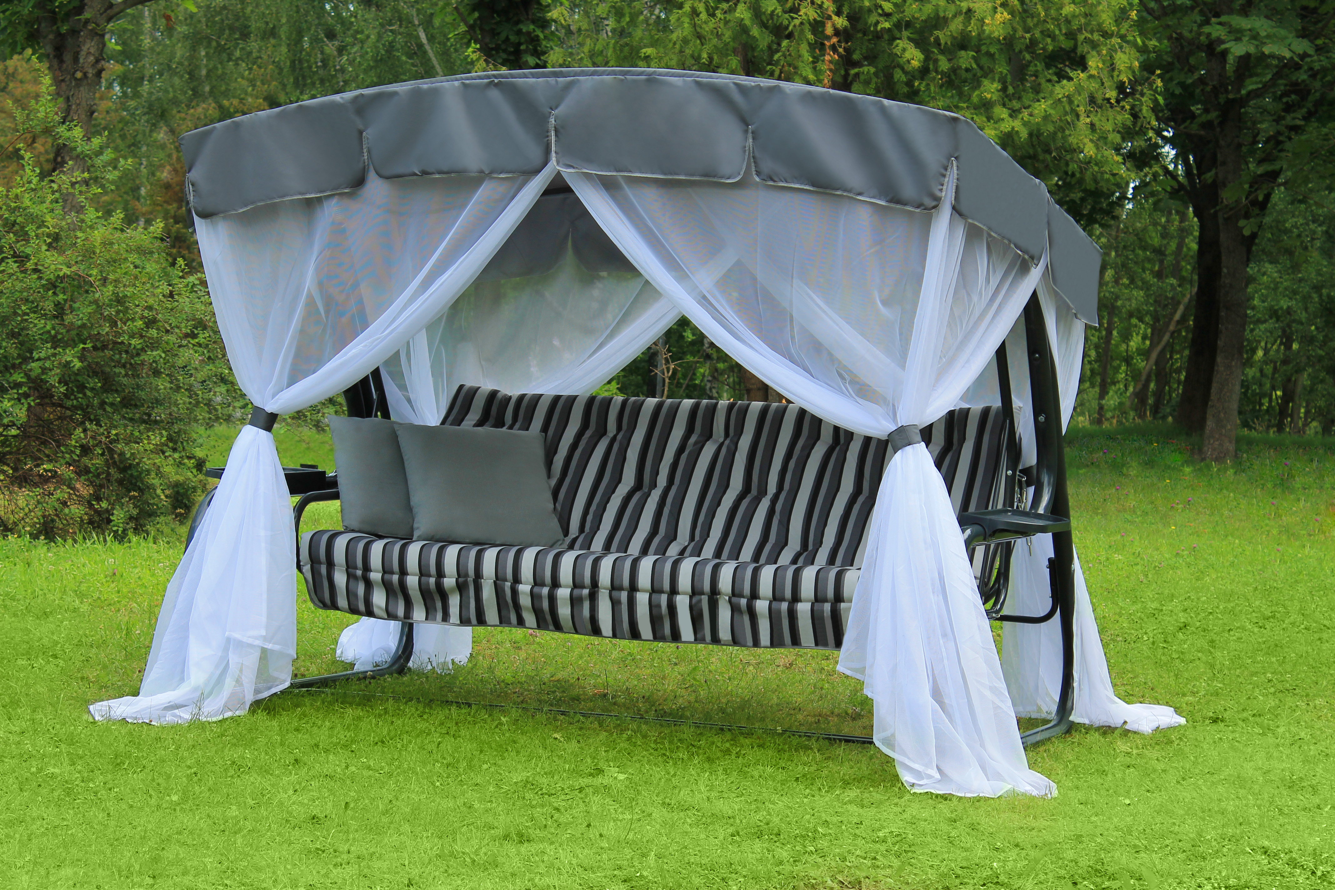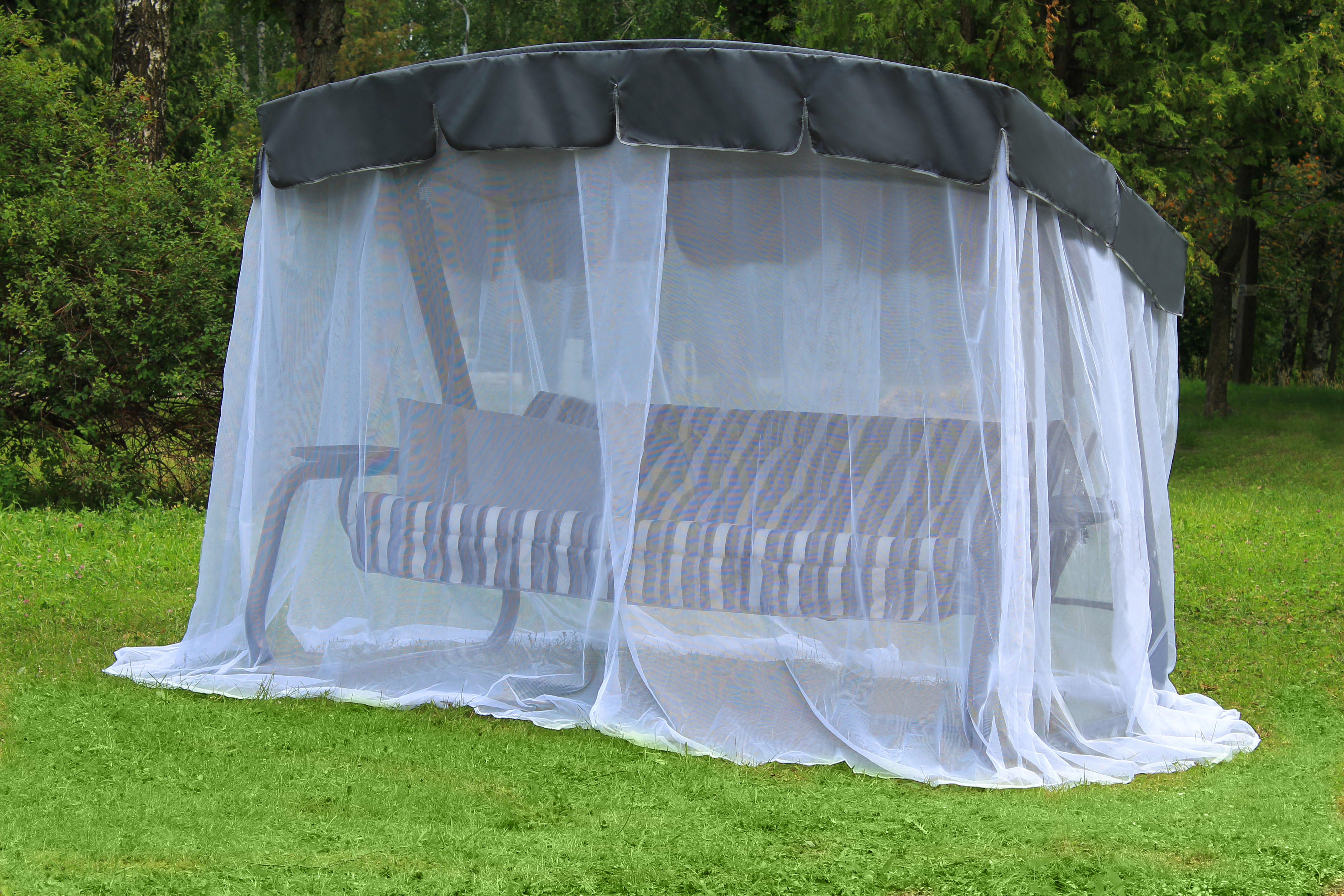 Тент: оксфорд плотность 180г/м2, москитная сетка (полотно гардинное) с напуском "запах" по 4-ем сторонам, завязки из тесьмы окантовочной в цвет тента на боковых сторонах "сетки", сетка пришивная.